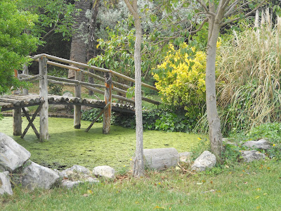 La originalidad del estanque de la foto la proporciona un viejo puente de madera que en contraste con la verde frondosidad de las plantas y el agua contribuyen a crear una atmósfera auténticamente natural.
